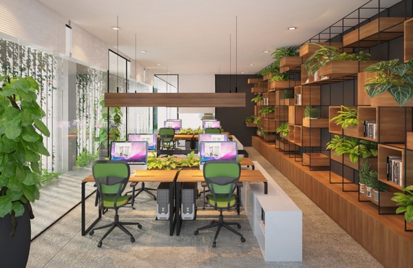 Không gian xanh dễ chịu vừa tô điểm thêm tính thẩm mỹ của văn phòng vừa mang đến bầu không khí trong lành, cảm giác dễ chịu cho tinh tần làm việc của nhân viên. Theo kinh nghiệm thi công thì thiên nhiên là “một liều thuốc” thư giãn hữu ích cho nhân viên. Nên dù diện tích nhỏ hay lớn việc bố trí cây xanh trong văn phòng là điều cần thiết.